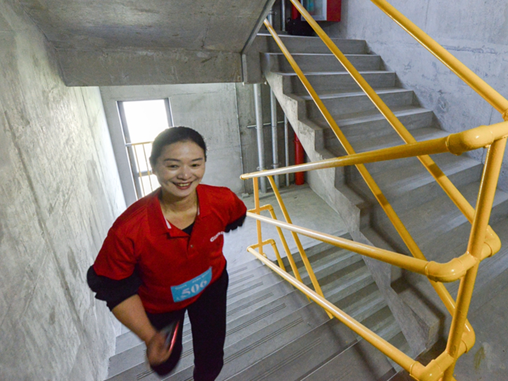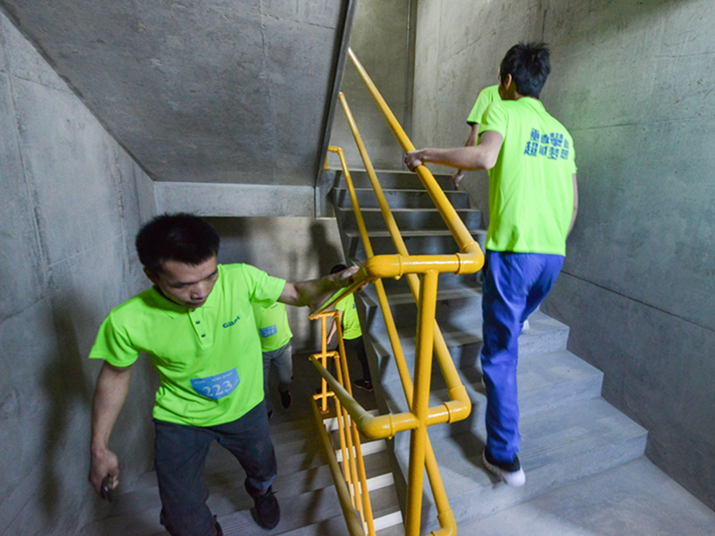 一聲令響,選手們分組出發(fā),向頂峰發(fā)起挑戰(zhàn),用奮進的腳步垂直穿越巨龍電梯試驗塔,競演一場階梯快速對決。攀登188米(相當于70層樓房)的垂直高度并不輕松,半程過后許多選手體力不支,需憑毅力,借助樓梯扶手繼續(xù)向上攀登,階梯上留下選手們的足跡,也灑下艱辛的汗水。